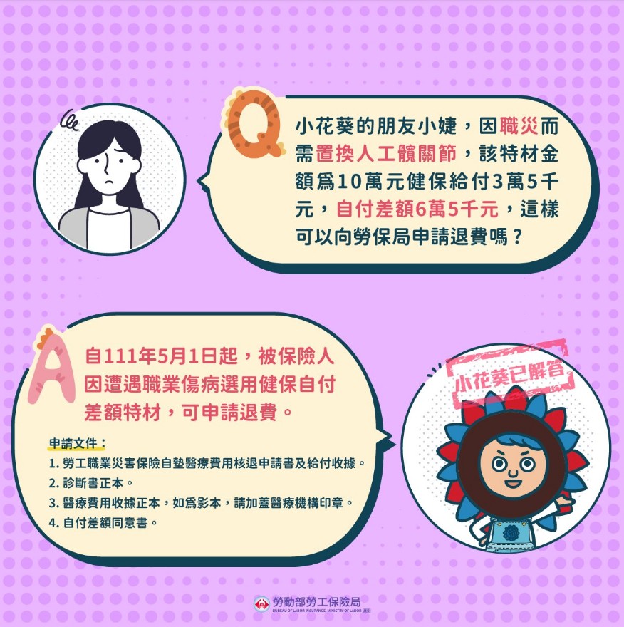 自111年5月1日起,被保險人因職業傷病及其引起之疾病,經全民健保特約醫院或診所醫師認定有醫療上需要,選用全民健康保險法第45條第1項所定自付差額特殊材料品項者,於先行墊付自付差額後,得向勞保局申請核退差額費用。