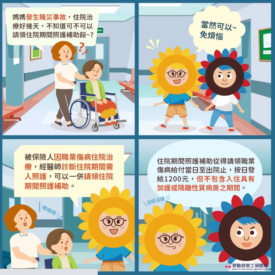 被保險人遭遇職業傷病不能工作,致未能取得原有薪資,正在門診或住院治療中,可自不能工作的第4日起,請領職災保險傷病給付。 - 照護補助: