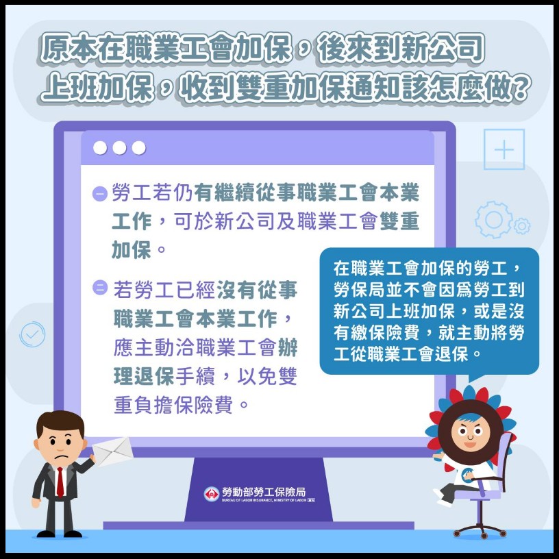 :在職業工會加保的勞工,勞保局並不會因為勞工到新公司上班加保,或是沒有繳保險費,就主動將被保險人從職業工會退保喔!