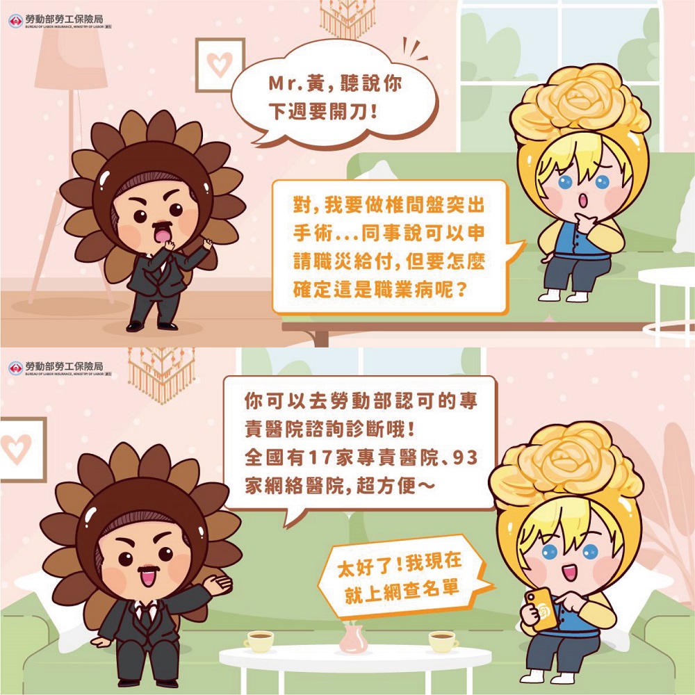 職業傷害係指在執行職務時,受到立即性意外的傷害;而職業病則為執行職務時,因暴露於化學性、物理性、生物性、人因性以及其他因子導致身體產生疾病,須經醫師診斷。如不確定所患傷病是否為工作所致,在申請職業傷病給付前,可先至勞動部認可職業傷病診治醫療機構開設之職業傷病門診,尋求相關諮詢及協助!