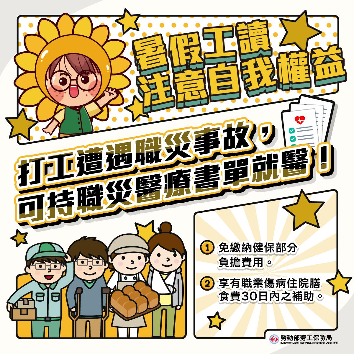 學生於暑期打工期間如遭遇職災事故,可持勞工職業災害保險職業傷病醫療書單至全民健康保險特約醫院或診所就醫,免繳納健保部分負擔及享有職業傷病住院膳食費30日內之補助。