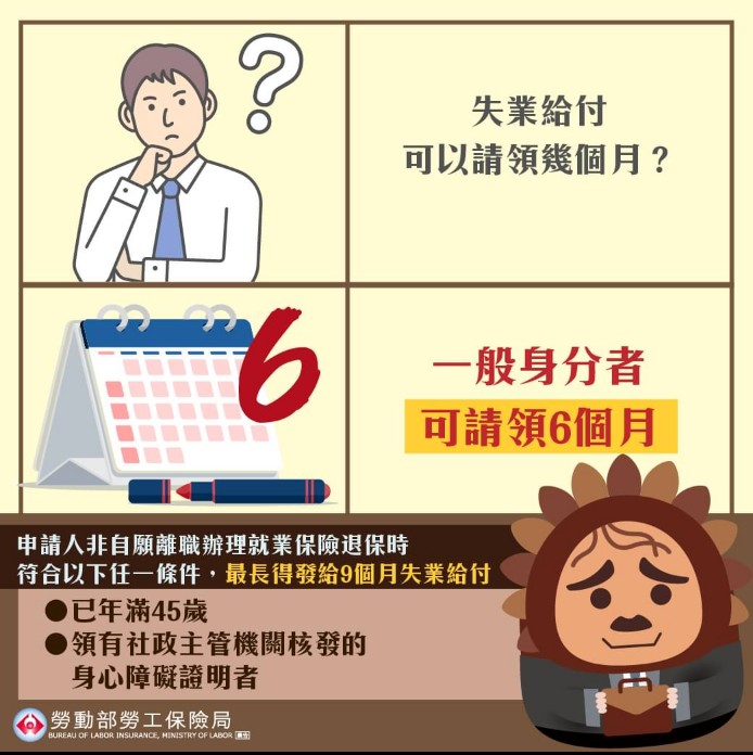 - (一) 失業給付最長發給6個月。但申請人離職辦理本保險退保時已年滿45歲或領有社政主管機關核發之身心障礙證明者,最長發給9個月。