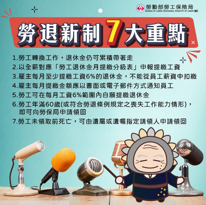 勞工退休金條例(勞退新制)於94年7月1日施行,雇主應為適用勞動基準法之勞工(含本國籍、外籍配偶、陸港澳地區配偶、永久居留之外籍人士),按月提繳不低於其每月工資 6% 勞工退休金,儲存於勞保局設立之勞工退休金個人專戶。