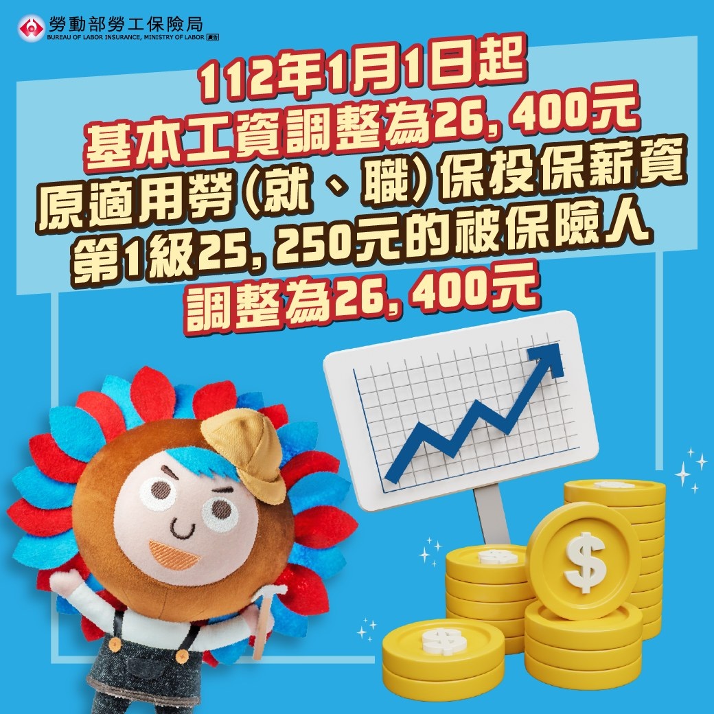 因應今年1月1日起基本工資調整為26,400元,「勞工保險投保薪資分級表」及「勞工職業災害保險投保薪資分級表」配合同步修正。