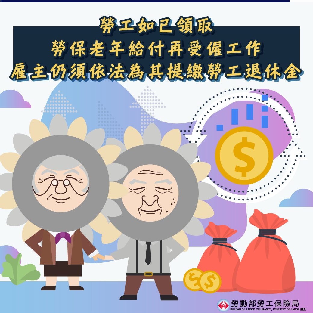 The New Labor Pension System and the Old-Age Benefits are different social security schemes and make double protection. According to Labor Pension Act, as long as the laborer (including citizens; foreign spouses; spouses from mainland, Hong Kong, or Macau; and permanent resident foreigners) could apply to Labor Standards Act, even though the labor has retired and claimed old-age benefits, the employer should contribute 6% (or more) of a laborer's monthly wages into an individual labor pension account managed by the Bureau of Labor Insurance. Once laborer reaches the age of 60 or loses ability to work (meet the article 24-2 of Labor Pension Act), the laborer may apply to the BLI to claim the principal and accrued dividends from individual labor pension account.