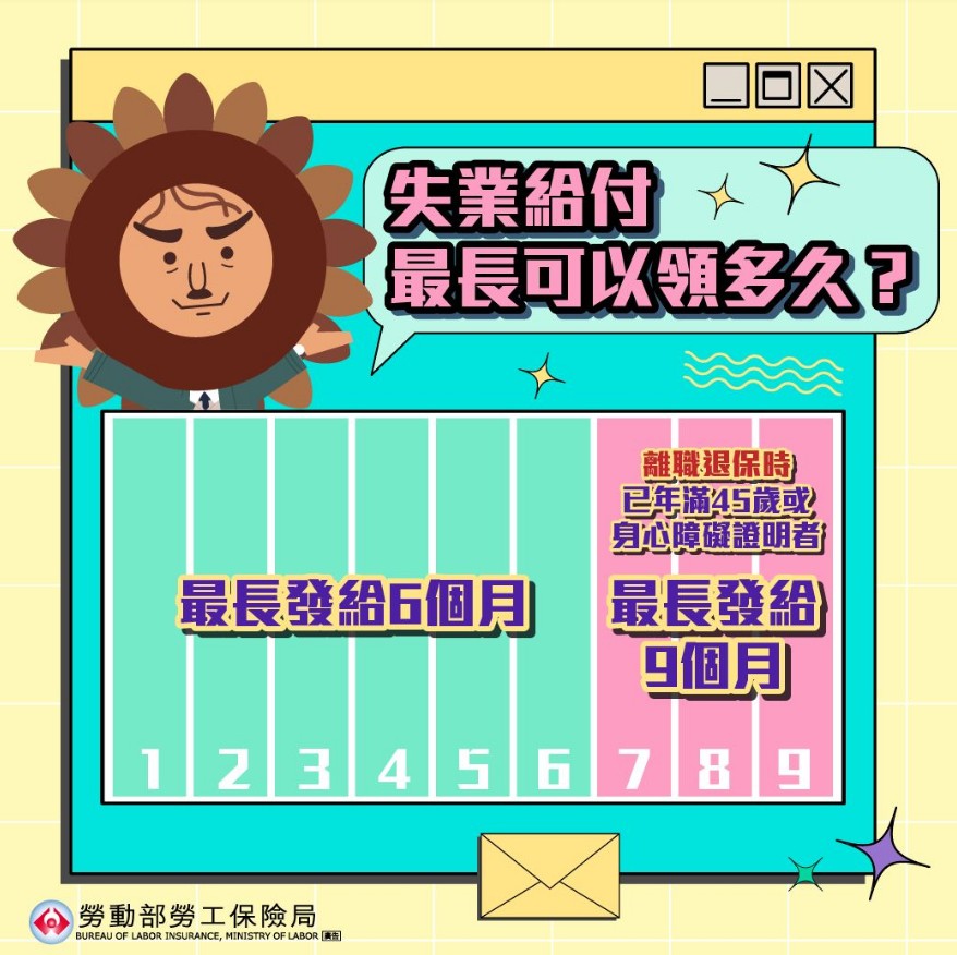 A:就業保險失業給付最長發給6個月,但申請人「離職退保時」已年滿45歲或領有社政主管機關核發的身心障礙證明者,最長發給9個月。