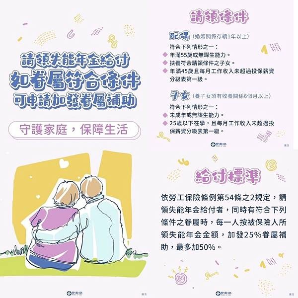 According to the Labor Insurance Regulations, for those who apply for disability pension benefit and have spouse or dependent children who meet the following qualification, 25% of the amount calculated according to Article 53 shall be granted as dependent allowance for each dependent, a maximum of 50% will be granted.