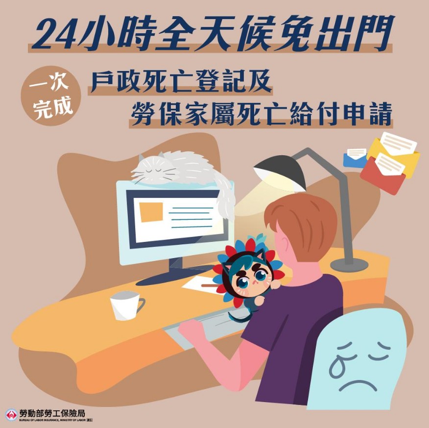 民眾透過內政部戶政司全球資訊網辦理「線上申辦死亡登記」時,可一併申請勞保家屬死亡給付,省時又便利!