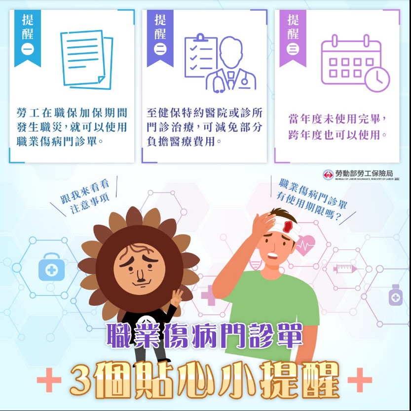If workers encounter occupational injury and disease while under coverage they may, while under coverage or for a 1 year period after their coverage has ended, seek treatment for the occupational injury. Simply present an Occupational Injury and Disease Outpatient Form issued by their insurance unit to any NHI hospital or outpatient clinic for exemptions to partial medical expenses as provided by NHI