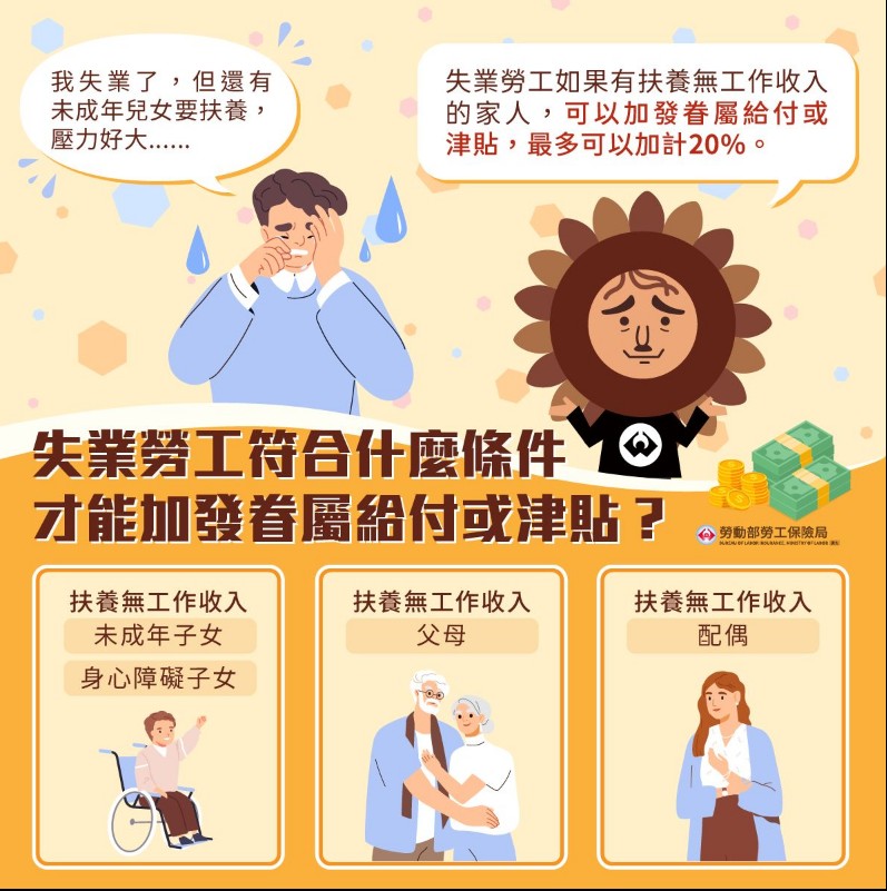During the period of receiving unemployment benefits or vocational training living allowance, for the unemployed laborers having no income parents, spouse, under aged children or children with physical or mental disability could apply for extra dependent benefits/allowance.