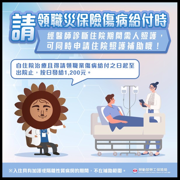 According to Article 42 of the Labor Occupational Accident Insurance and Protection Act, the insured person is hospitalized due to occupational injury or sickness, and is diagnosed by their doctor where the insured person was treated that the insured person needs personal care while being hospitalized, they may also apply Care Subsidy when claiming Occupational Accident Insurance.