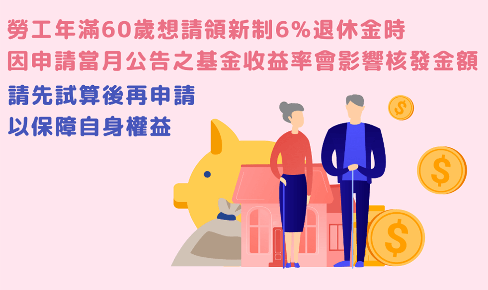 參加勞退新制的勞工,只要年滿60歲,無論在職與否,皆符合請領新制勞工退休金資格,所領取之退休金,包括勞工個人退休金專戶之本金及累積收益,該累積收益金額,除歷年已分配入專戶之收益外,還有當年度至申請當月止尚未分配期間之收益(可能為正值或為負值),係以申請當月基金運用局公告最近月份之收益率計算至申請當月止。