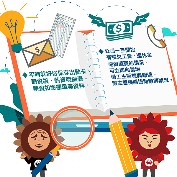 如:積欠前3個月迄今的薪資條、出勤紀錄、個人的薪資轉帳內頁影本、領現金的簽收條等,以便將來申請工資墊償派上用場。