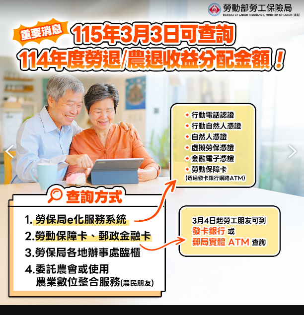 自 115年3月3日起,就能查詢114年度「勞退個人專戶收益分配金額」及「農退個人專戶收益分配金額」囉!