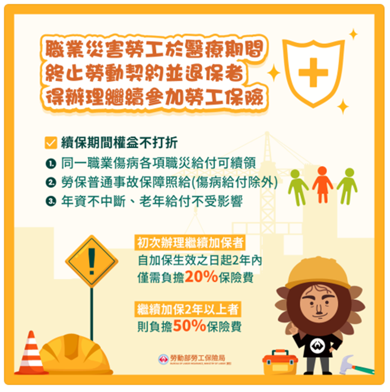 勞工朋友如遭遇職業災害,於醫療期間與雇主終止勞動契約並退保,得於退保之日起5年內,辦理繼續參加勞工保險。