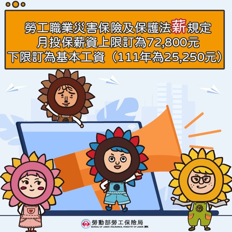 《勞工職業災害保險及保護法》(下稱災保法)自111年5月1日施行,為提供勞工更適足之職業災害保險(下稱職保)保障,災保法月投保薪資上限訂為72,800元,下限訂同基本工資(111年為25,250元),且雇主職保之投保薪資應為最高級距。