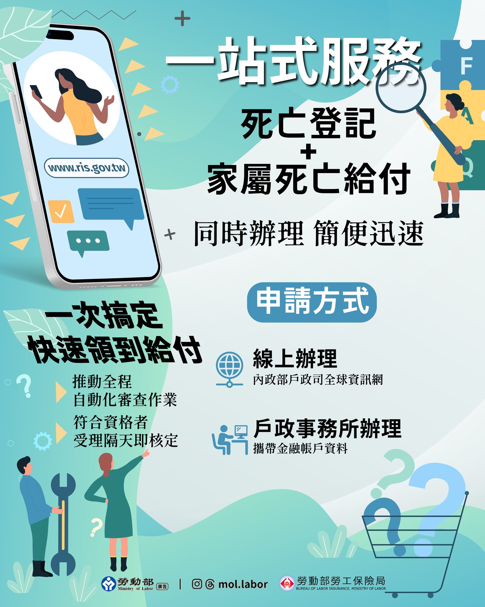 一站式服務同時辦理死亡登記及勞保家屬死亡給付,一次完成,簡便迅速!