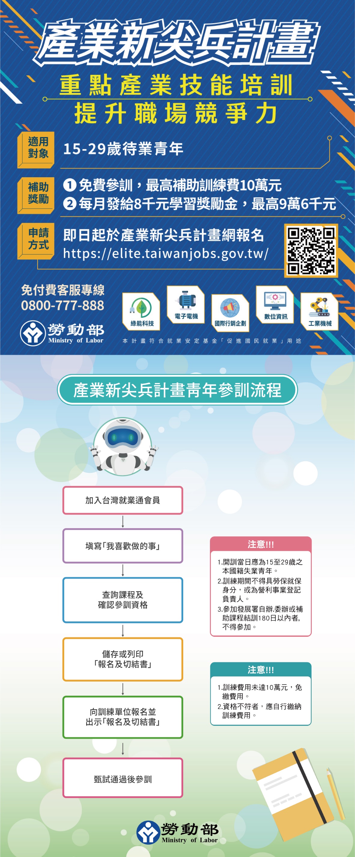 勞動部提醒有意願報名「產業新尖兵計畫」的青年,應先至「台灣就業通」網站完成「我喜歡做的事」職涯興趣測驗,以釐清個人志向與參訓方向。訓練期間每月提供學習獎勵金8千元以安心參訓,辦訓單位亦會協助學員後續的就業輔導與媒合、教導履歷撰寫及面試技巧,並於結訓前邀請用人企業進行人才招募,辦理現場媒合及推介,協助參訓學員順利投入職場。有興趣的青年朋友歡迎至「產業新尖兵計畫」網站查詢課程資訊,相關問題可洽詢免付費客服專線0800-777-888由專人提供服務。