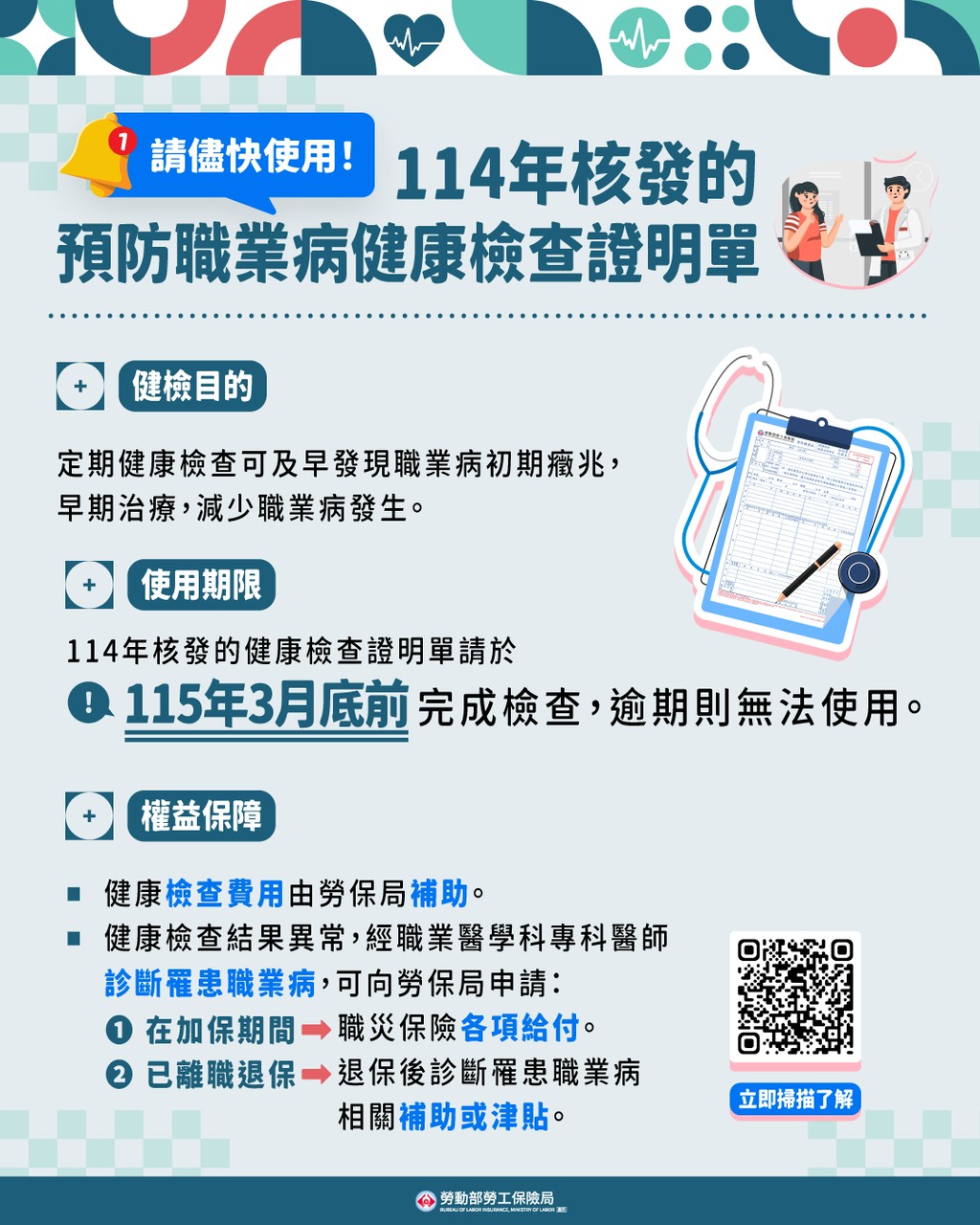 年關將近,勞保局114年度核發之預防職業病健康檢查證明單有效期限將於115年3月底截止,如持有該證明單而尚未檢查者,請儘速至醫院受檢,以維護自身權益,逾期醫院將不受理。