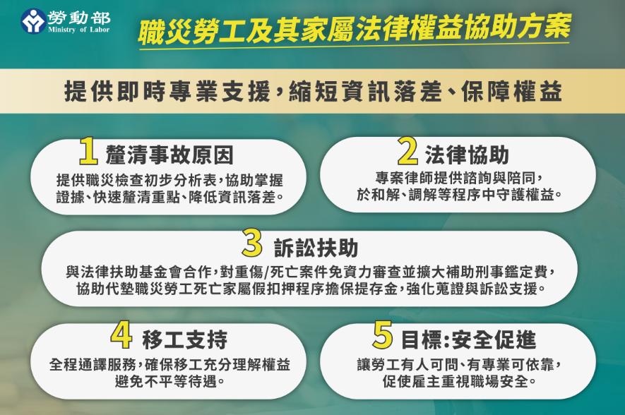 「職災責任的追究不是職災勞工自己的事」,勞動部站在支持職災勞工這邊,協助職災勞工及家屬走出難關,勞動部推動「職災勞工及家屬法律權益協助方案」(以下簡稱協助方案),從職災發生後即提供職災原因初步分析、專業律師諮詢、陪同和解與調解,到訴訟扶助等完整的法律支援,確保職災勞工及家屬能獲得應有的補償與賠償,同時也促使雇主更加重視職場安全衛生。