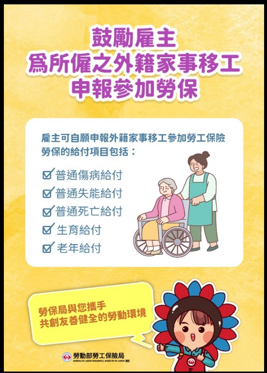 鼓勵雇主為所僱之家事移工申報參加勞保,使其在台工作期間獲得更完整之勞動權益保障,協助其遭遇事故時,可及時請領相關給付,協助其維持基本經濟生活,共創友善健全的勞動環境![]()