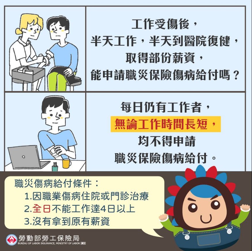 職災保險傷病給付是以被保險人遭遇職業傷病致「全日」不能工作4日以上為給付要件,因此,被保險人如發生職災事故,每日仍有工作事實,無論工作時間長短,均不得請領職災保險傷病給付。