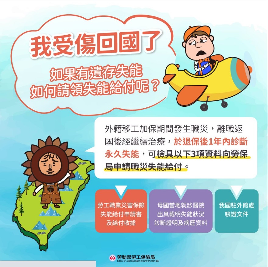 職災移工離職返回母國後經繼續治療,失能症狀固定,於退保後1年內診斷永久失能,可自行或委託發生職業災害的原投保單位向勞保局申請職災失能給付。