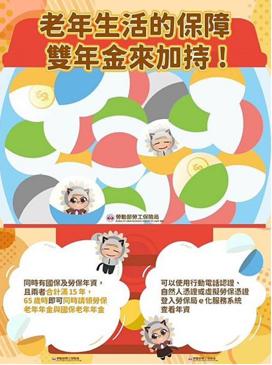 勞保年資未滿15年無法請領勞保老年年金者,如同時有國保年資,且兩者合計滿 15 年,65 歲時即可同時請領勞保老年年金與國保老年年金,活到老領到老,為老年生活提供雙重保障!