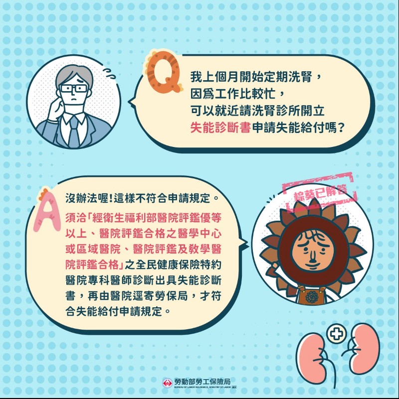 被保險人如因罹患傷病,經治療後,症狀固定,需終身定期做透析治療(洗腎),須洽「經衛生福利部醫院評鑑優等以上、醫院評鑑合格之醫學中心或區域醫院、醫院評鑑及教學醫院評鑑合格」之全民健康保險特約醫院專科醫師診斷出具失能診斷書,再由醫院逕寄勞保局,才符合失能給付申請規定。