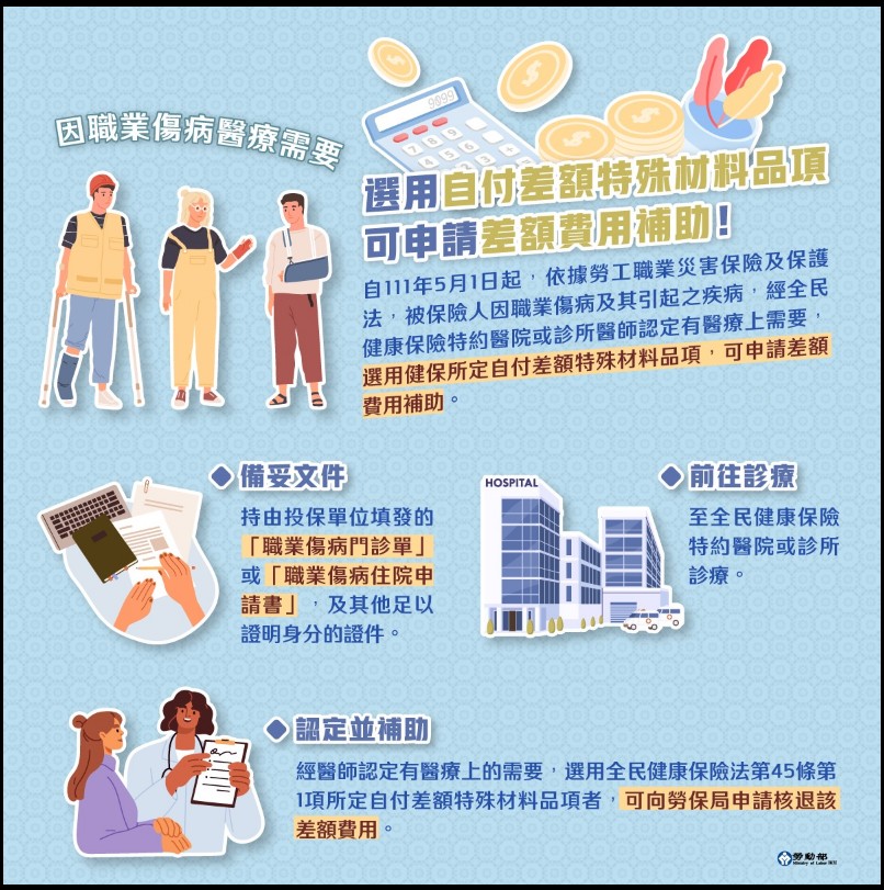 ❏ 勞工職業災害保險及保護法上路後,被保險人因職業傷病及其引起之疾病,經全民健康保險特約醫院或診所醫師認定有醫療上需要使用自付差額特殊材料品項者,於先行墊付自付差額後,得向勞工保險局申請核退該差額費用!