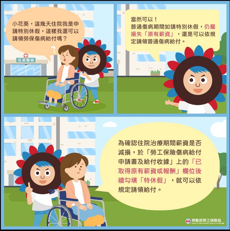 為確認薪資是否減損,於「勞工保險傷病給付申請書及給付收據」有「被保險人因傷病住院不能工作期間取得薪資(或報酬)情形」的欄位,被保險人如請特別休假,請於「已取得原有薪資或報酬」欄位後續勾填「特休假」,就可以依規定請領給付。