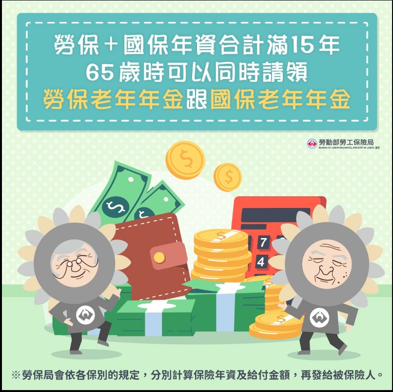 如果勞保和國保年資合計滿 15 年,65 歲時可以同時請領勞保老年年金跟國保老年年金。