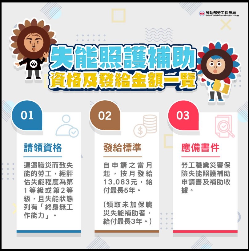 遭遇職災而致失能的勞工,經評估為終身無工作能力,日常生活自理能力須專人照護,符合資格者可申請失能照護補助。