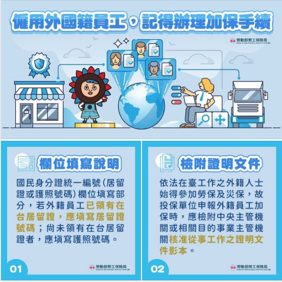 Only foreign nationals who are legally employed in Taiwan are eligible to participate in labor and occupational accident insurance. When insuring foreign employees, a photocopy of their work permit issued by the central competent agency or competent agency of their industry must be provided.