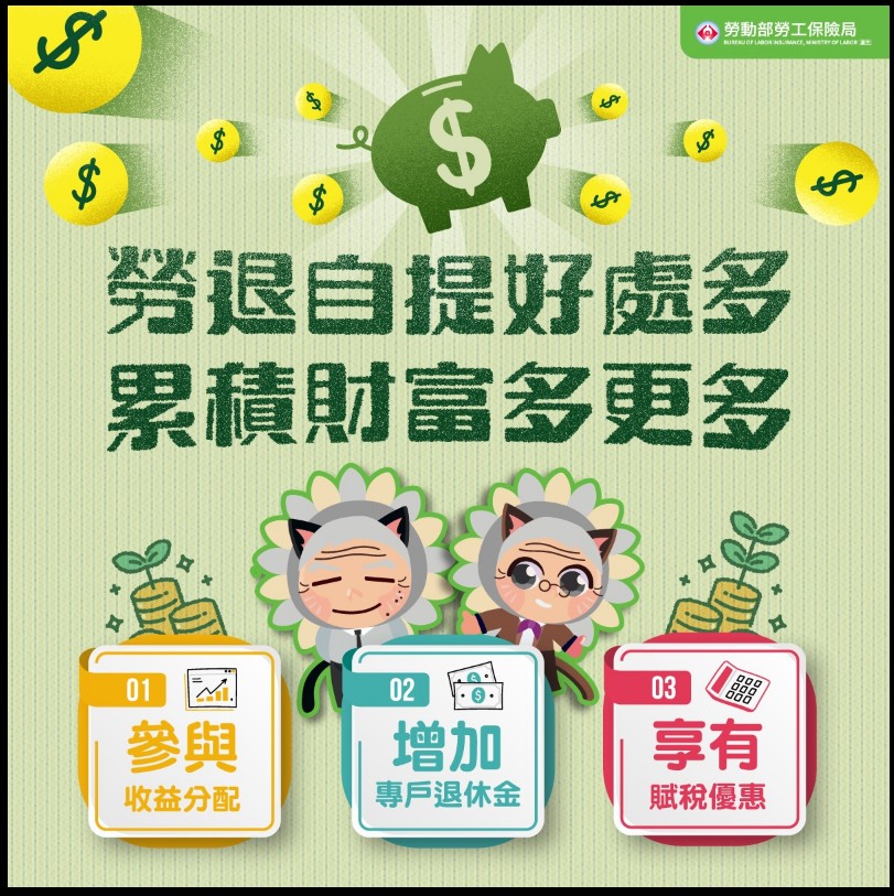 - (四) 實際從事勞動的雇主、自營作業者、受委任工作者、不適用勞動基準法的勞工,亦可於每月工資或執行業務所得6%範圍內自願提繳退休金,同樣享有收益分配等好處。