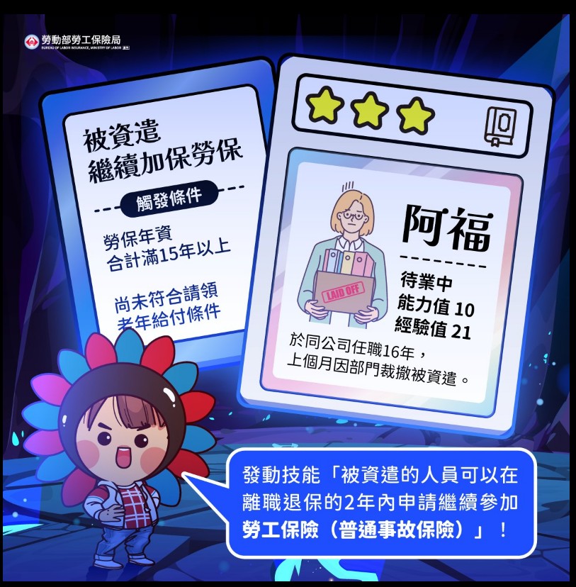 被投保單位裁減資遣的人員,如果同時符合以下2要件,可以在離職退保的2年內申請繼續參加「勞工保險(普通事故保險)」喔!![]()