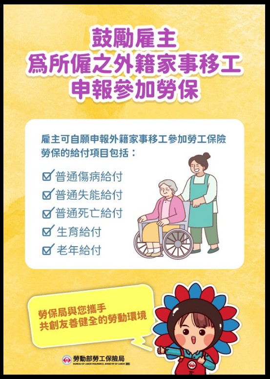 鼓勵雇主為所僱之家事移工申報參加勞保,使其在台工作期間獲得更完整之勞動權益保障,協助其遭遇事故時,可及時請領相關給付,協助其維持基本經濟生活,共創友善健全的勞動環境![]()