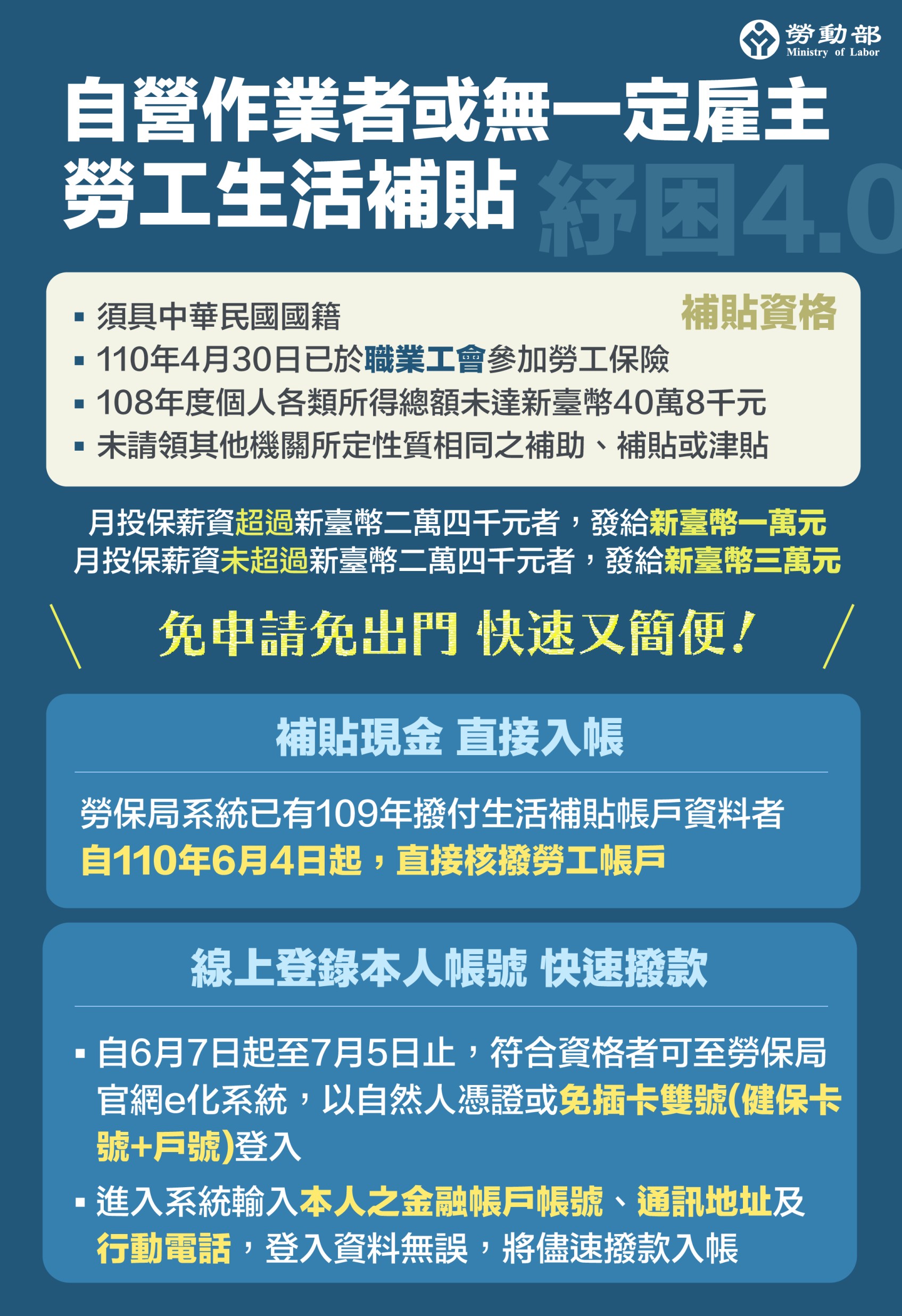 勞動部紓困4.0🔎【自營作業者或無一定雇主之勞工生活補貼】🔎