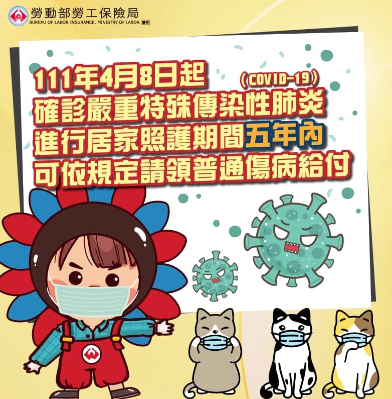 💡考量整體防疫政策及被保險人給付權益,確診嚴重特殊傳染性肺炎(COVID-19)的被保險人,自111年4月8日起進行居家照護的期間,得依勞工保險條例第33條規定請領普通傷病給付。​