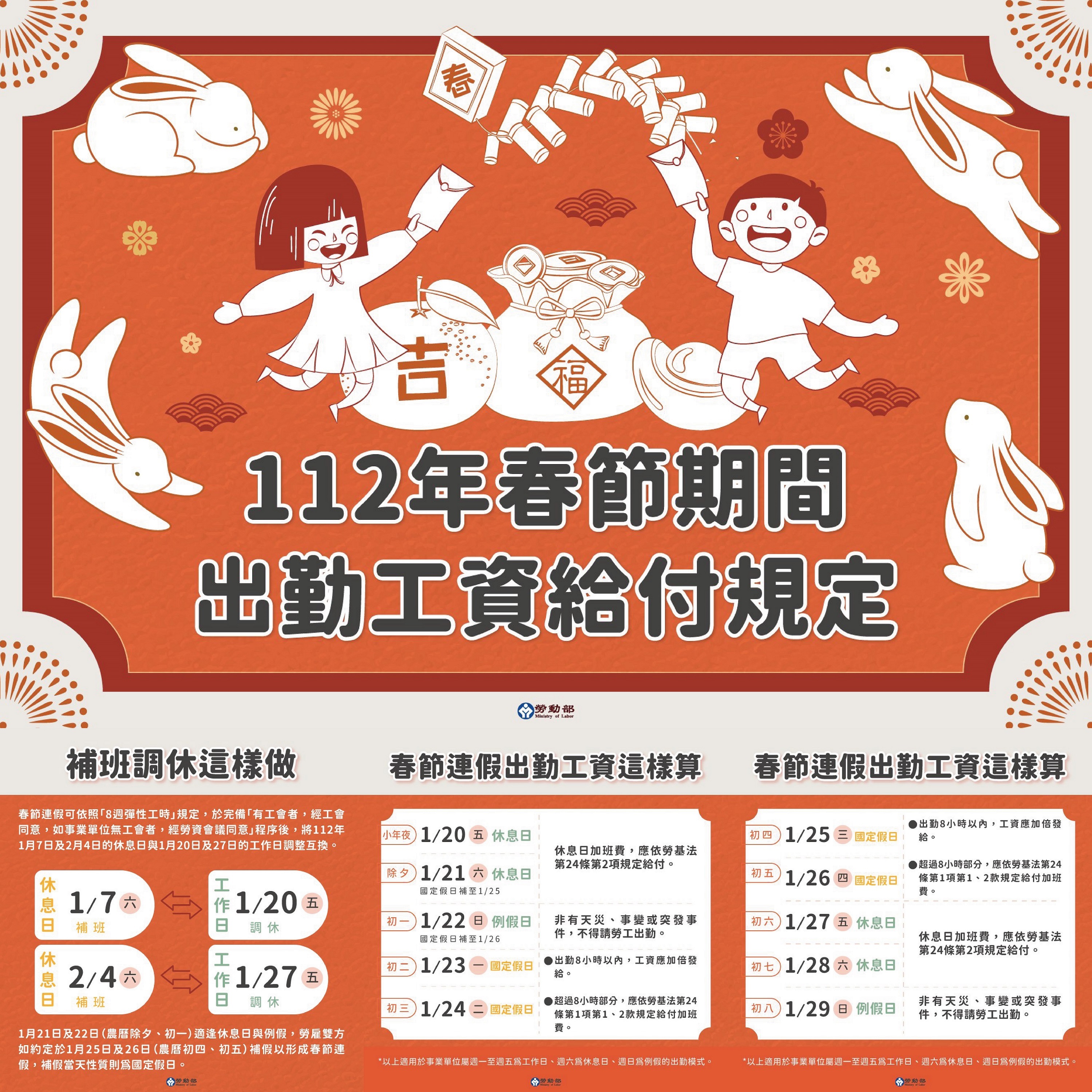 勞動部強調,112年春節連假期間之出勤及工資給付,事業單位應依法辦理。雇主如有違反相關規定,勞工可檢具相關事證,就近向當地勞工行政主管機關【直轄市、縣(市)政府勞工局(處)或社會局(處)】申訴,以維權益。