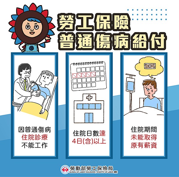 只要是勞工保險被保險人於保險有效期間內因遭遇「普通傷害」或「普通疾病」(以下稱普通傷病)住院診療不能工作,以致未能取得原有薪資,正在治療中者,自住院不能工作的第4日起至出院日止,即可請領普通傷病補助費,但出院後的門診或在家療養期間則不在給付範圍喔!