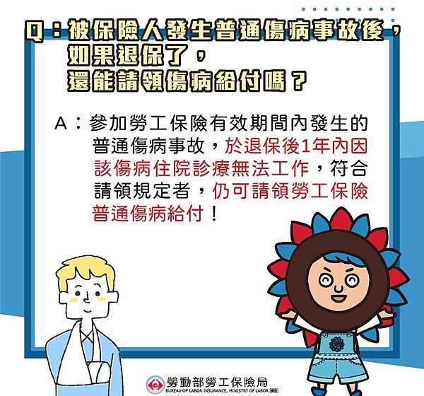 可以喔,被保險人在參加勞工保險有效期間內發生的普通傷病事故,於退保後1年內因該傷病住院診療無法工作,符合請領規定者,仍可享有請領勞工保險普通傷病給付的權利!