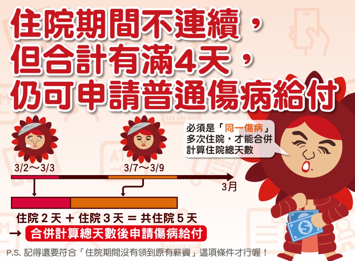 其實只要是「同一傷病」住院的天數可以合併來算,就像本圖案例中紅葵兩次住院皆未滿4天,但將同一傷病累計來看共住院滿5天,即可向勞保局申請發給2天的傷病給付喔~