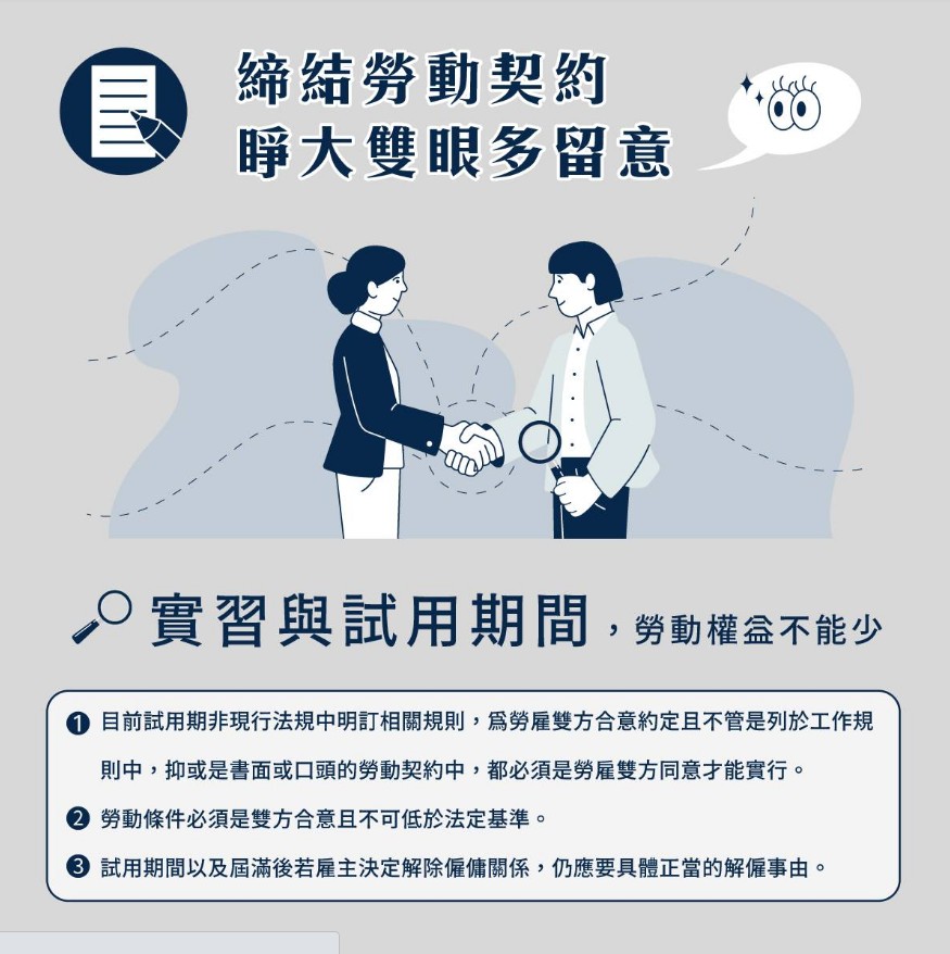 ➌試用期間以及屆滿後若雇主決定解除僱傭關係,仍應要具體正當的解僱事由,不得以試用期為由,任意解僱員工。
