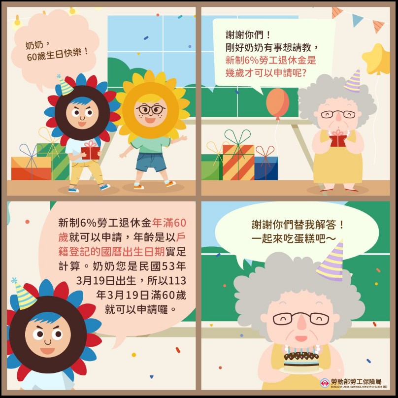 :新制6%勞工退休金年滿60歲就可以申請,年齡的計算係以戶籍之記載為準,即以登記的國曆出生日期實足計算。奶奶您是民國53年3月19日出生,所以113年3月19日滿60歲就可以申請囉。