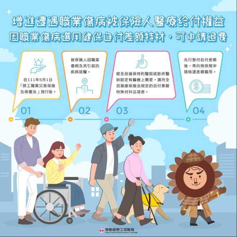 If due to injury/sickness caused by occupational reasons, the insured person is identified as having medical needs by the physicians in the NHI hospitals or clinics and such insured person selects special materials and items specified in the National Health Insurance Act, he/she may, after settled the partial out-of-pocket payment, apply to the BLI for the reimbursement of such payment. This took effect on May 1, 2022, the implementation date of the Labor Occupational Accident Insurance and Protection Act. It will provide further protection to the rights and interests of the workers suffering from occupational injury/sickness.