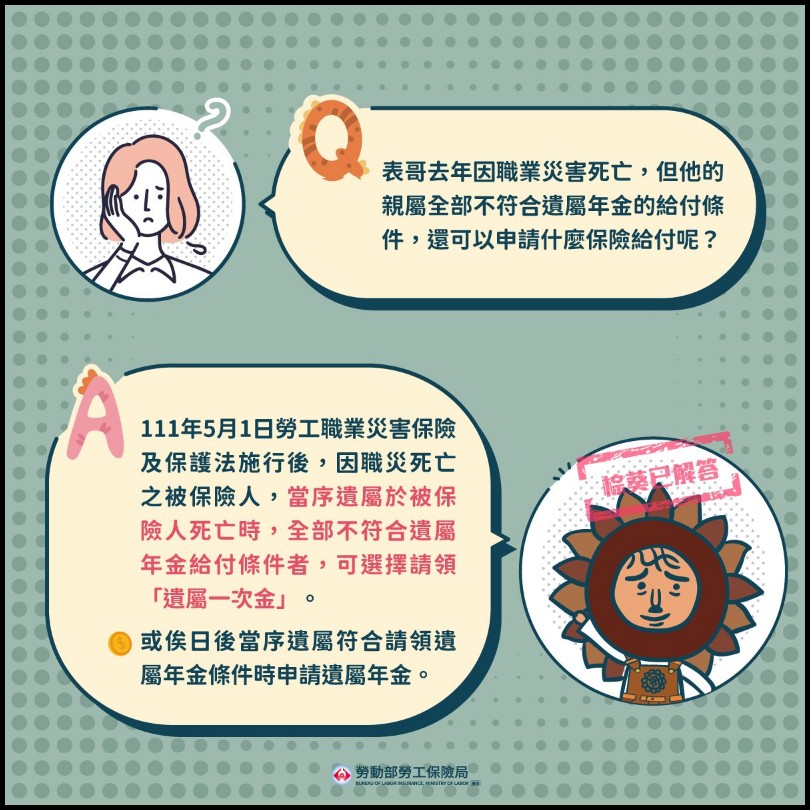 111年5月1日勞工職業災害保險及保護法施行後,因職業傷病致死亡之被保險人,當序遺屬於被保險人死亡時,全部不符合遺屬年金給付條件者,可選擇請領「遺屬一次金」,或俟日後當序遺屬符合請領遺屬年金條件時申請遺屬年金。
