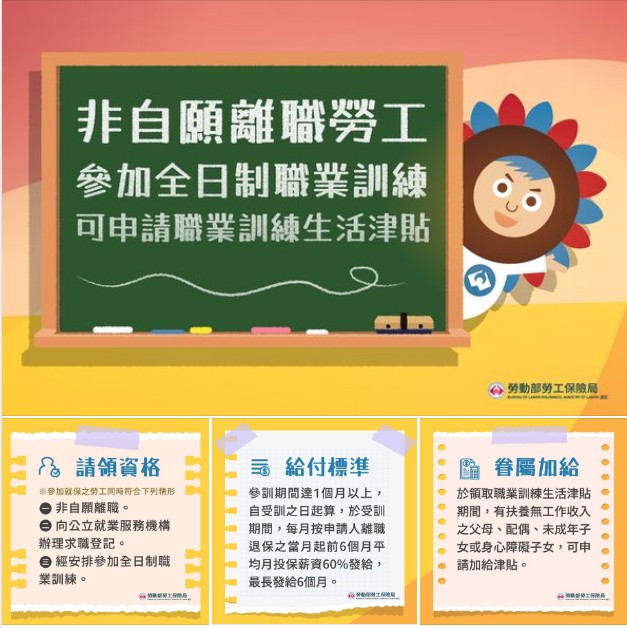 參加就業保險之勞工同時符合下列情形,可申請就保職業訓練生活津貼:
