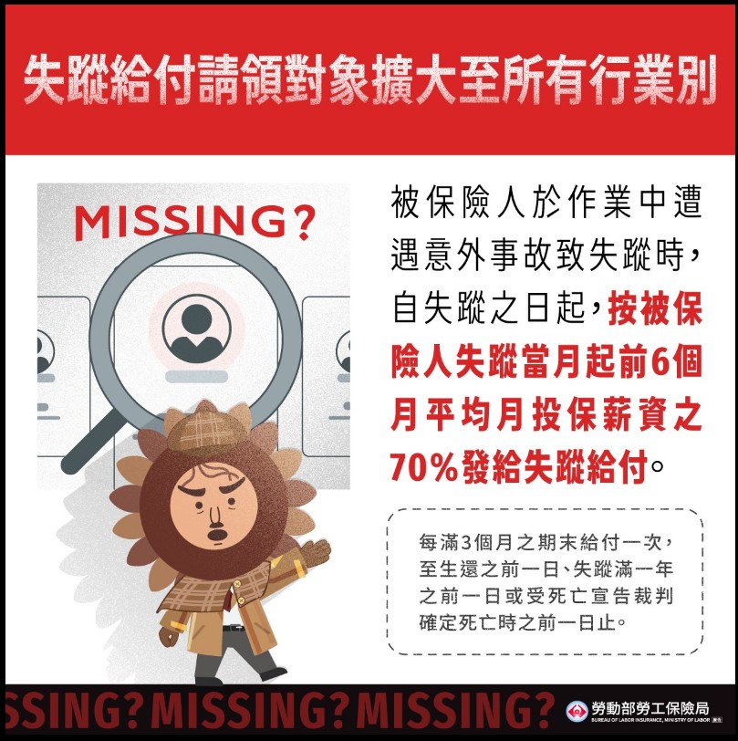 Once the Labor Occupational Accident Insurance and Protection Act was implemented, missing persons are no longer limited to those who work in the fishing industry, aviation, naval vessels, or mines. If the insured person “suffers an accident and goes missing”, which happened on work ,the beneficiary can claim the benefit, which standard is based on 70% of the insured's average monthly insured salary will be given to the disappearance benefit since the date of disappearance.