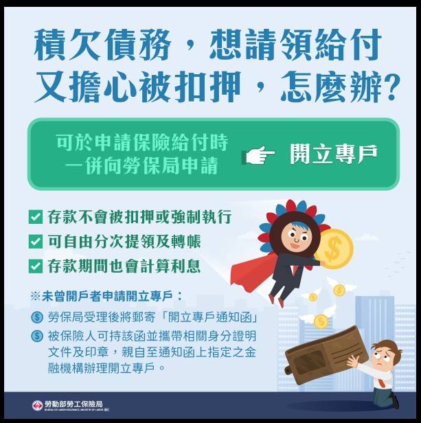 ????‍♀️因債務問題擔心申請的保險給付被扣押,可於申請保險給付時一併向勞保局申請「開立專戶」,專戶內的存款不用擔心會被扣押或強制執行,而且和一般存款帳戶一樣可以自由分次提取及轉帳,存款期間也會計算利息????